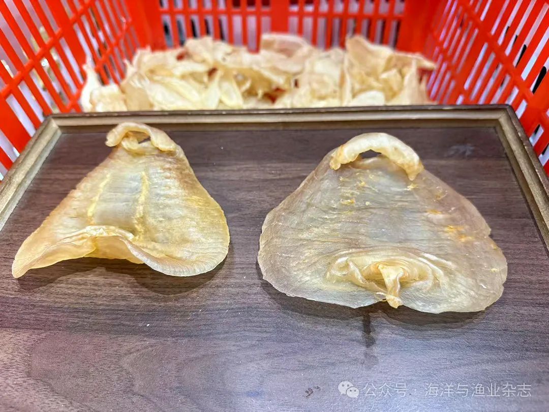 “市场上的‘花胶’是一个统称,种类大概有200多种,潮汕地区因为是赤嘴鮸的产地,所以常吃的是赤嘴鮸鱼胶。拿到光里看,赤嘴鮸鱼胶有它独特的黄金线。”郑玉娜在基地鱼胶展示区,指着不同的鱼胶向记者介绍。赤嘴鮸鱼胶按产地、款式及不同鱼种,在市面上可以分为多个品类,如湛江赤嘴、台山赤嘴、阳江赤嘴和饶平赤嘴等。