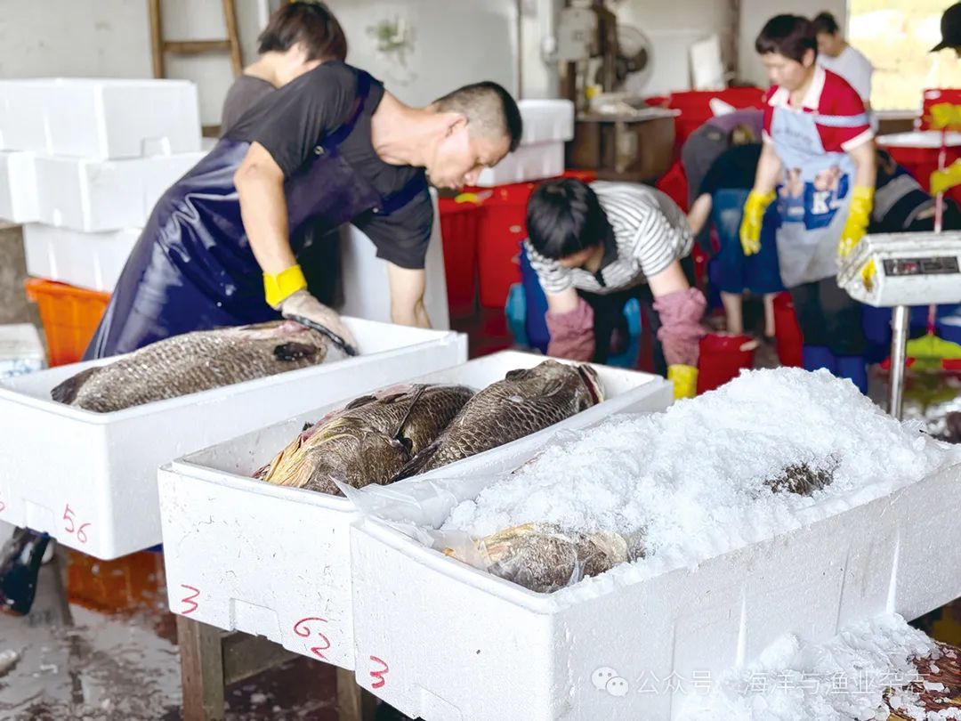 另一边,打包区的工人更是忙碌。他们将简单处理好的鮸鱼肉整齐地码放在泡沫箱中。从制冰厂来的大量碎冰如同白色的瀑布倾泻而下,迅速填满箱内每一个空隙,确保温度保证鱼肉不会变质。随后,封箱、贴标、扫码、清数,空气中弥漫着冰冷的水汽,与工人们额角滚落的汗珠形成奇特的对比。