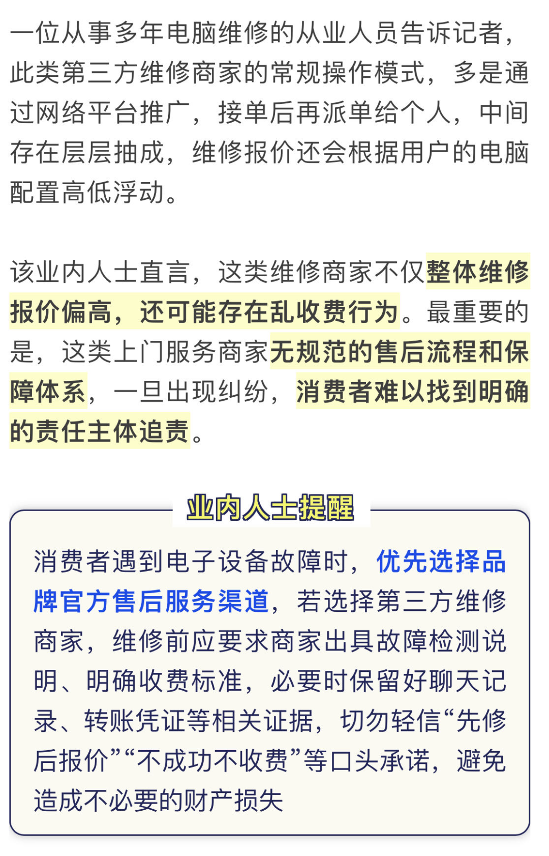 随后,记者以消费者的身份向京东官方核实,客服明确表示,目前京东并未与外部平台开展此类电脑维修合作业务,同时客服提醒记者务必仔细甄别商家身份,避免上当受骗。