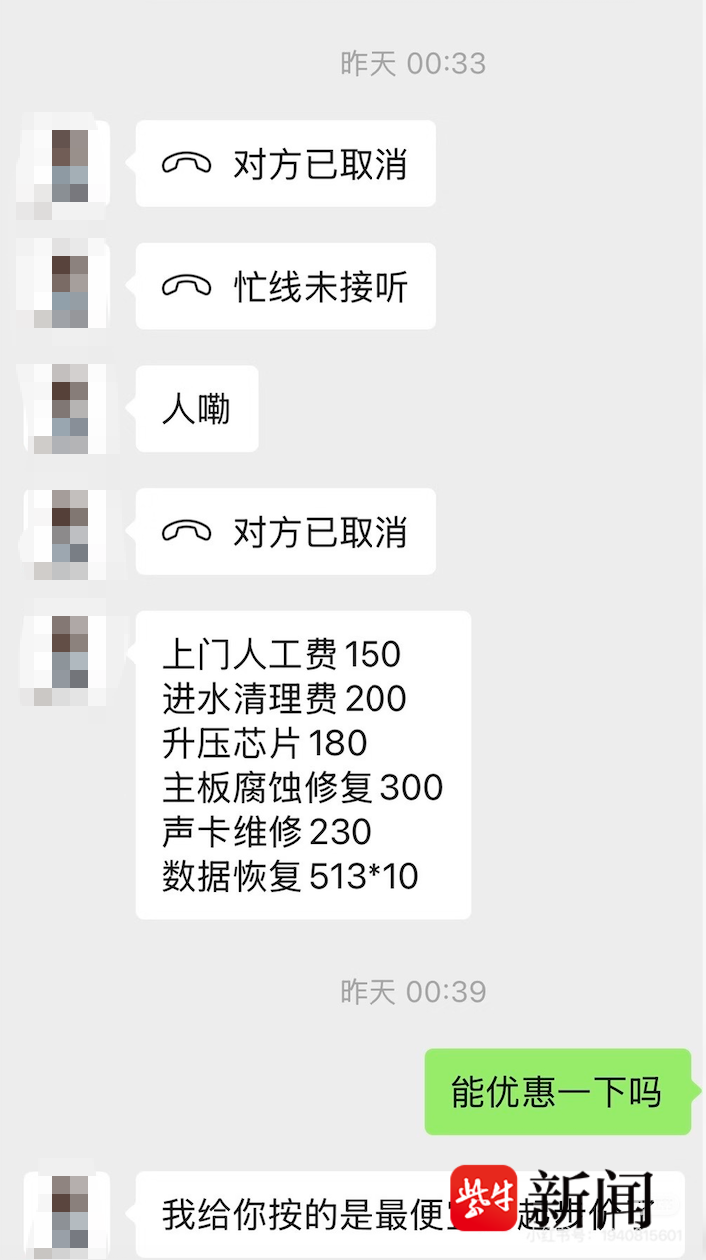 小王向记者透露,送回电脑时对方强行要求她同学上车检查电脑,解锁电脑后,维修师傅通过微信发来费用清单,写着“上门人工费150元、进水清理费200元、升压芯片180元、主板腐蚀修复300元、声卡维修230元、数据恢复513×10元”,总计6190元。小王虽然觉得价格不合理,但是因为当时已是深夜,担心同学的人身安全只能先付了钱。