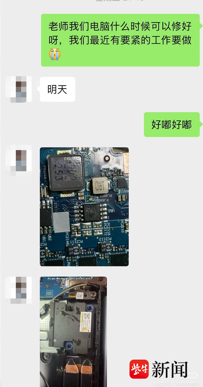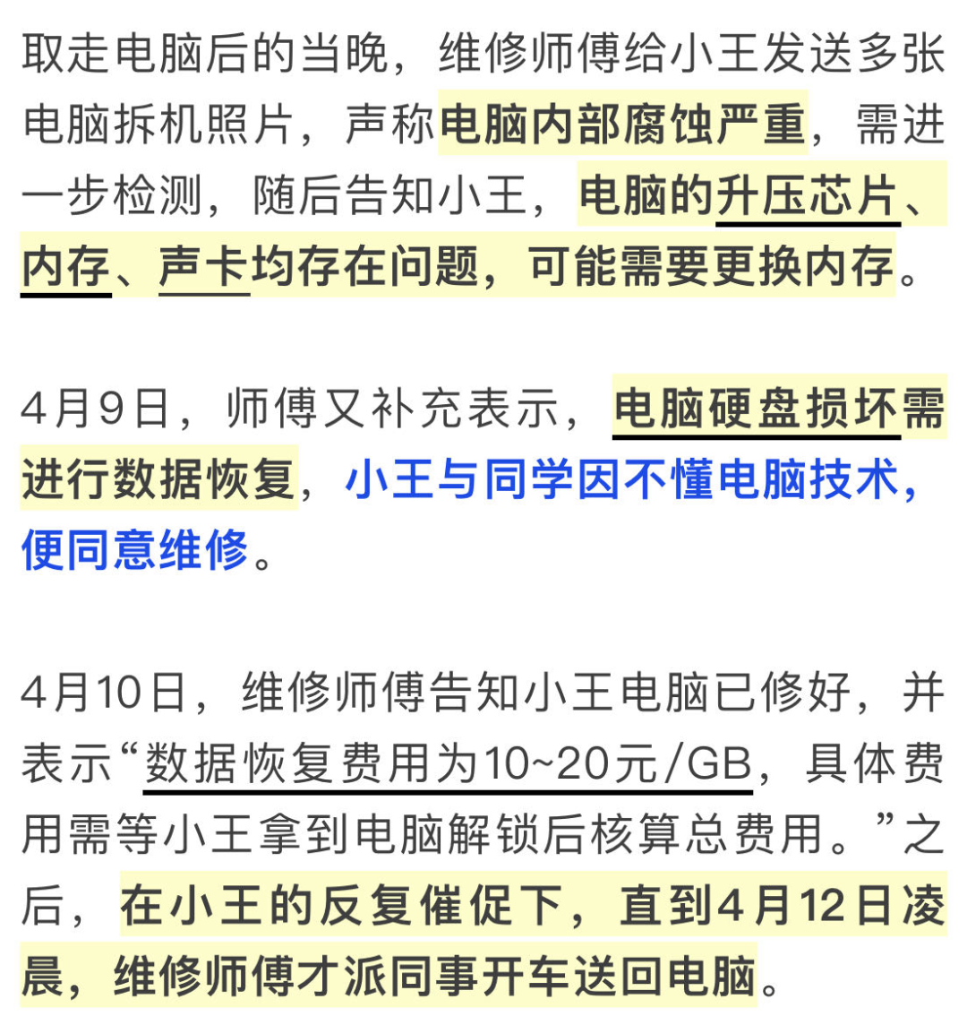 小王告诉记者,4月8日下午,她不慎将矿泉水洒在同学的联想笔记本电脑上,因缺乏维修经验且急于处理,她便在网络平台搜索电脑维修服务。