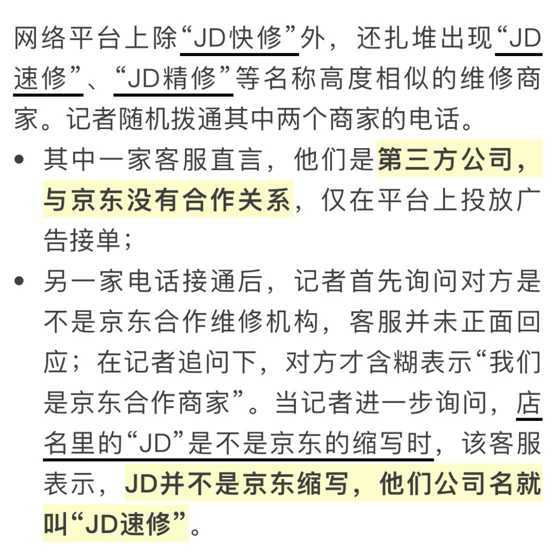 小王表示,由于平台上“JD快修”的图标和配色跟京东相似,让她误以为就是京东官方维修服务。记者调查发现,此类包含“JD”的维修店铺实际上与京东并无任何关联。